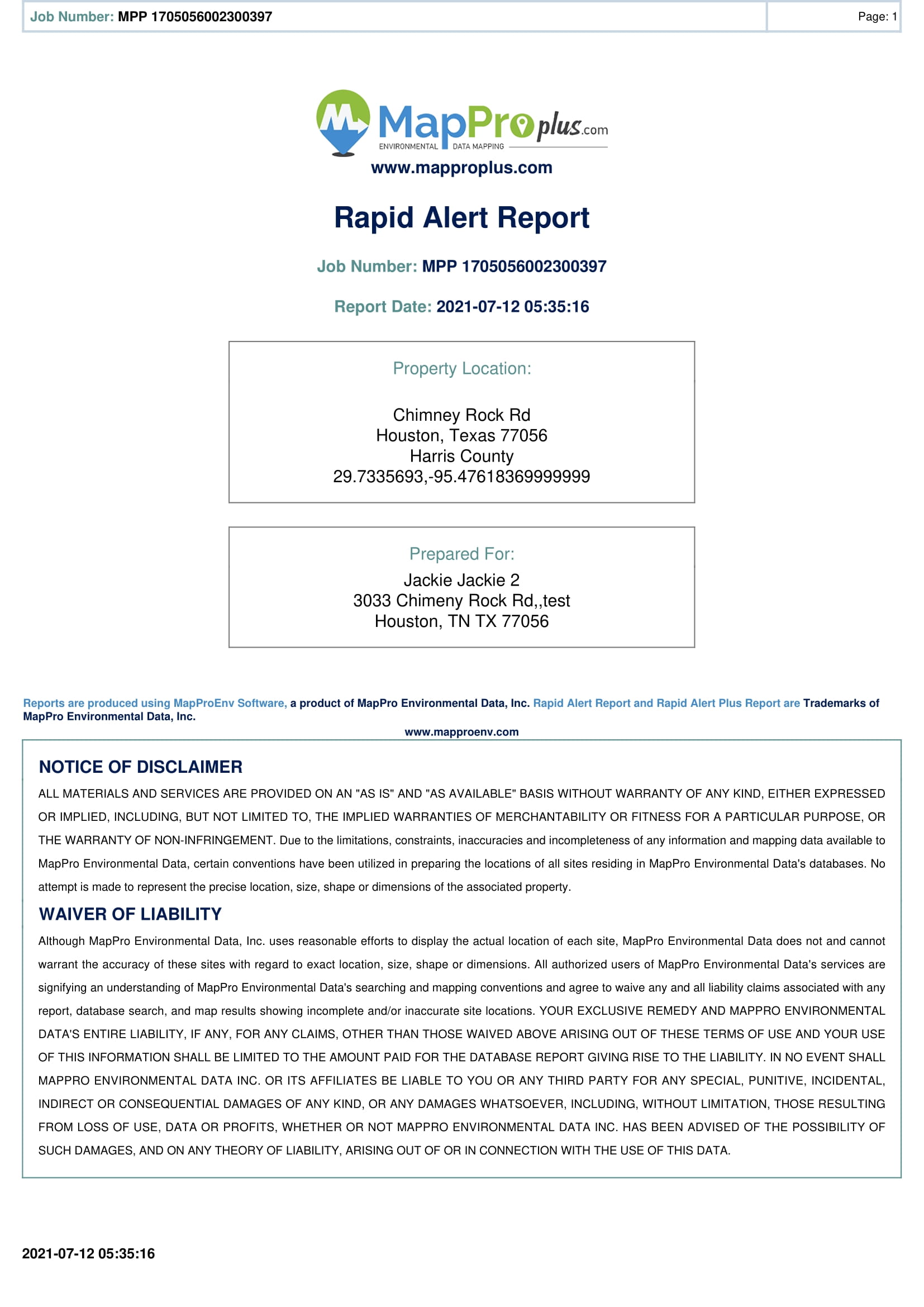 MapPro Plus is a real-time environmental mapping application utilized by environmental engineers, lenders, real estate professionals and more. The MapPro Plus system creates an interactive environmental hazard map and instant downloadable reports with just a click. Any real estate property you select will generate a custom Rapid Alert or Rapid Alert Plus report based on the property address. These specialized reports include hazard ratings alerting you to possible environmental risks on or near the site chosen. The reports span an 1/8 mile radius from the selected address, are auto-generated from federal, state and local databases and are constantly being updated. This property data helps appraisers, lenders, buyers and sellers make the best decision and avoid possible environmental hazards in any real estate transaction. Register today and download your first Rapid Alert report for only $5.00.
